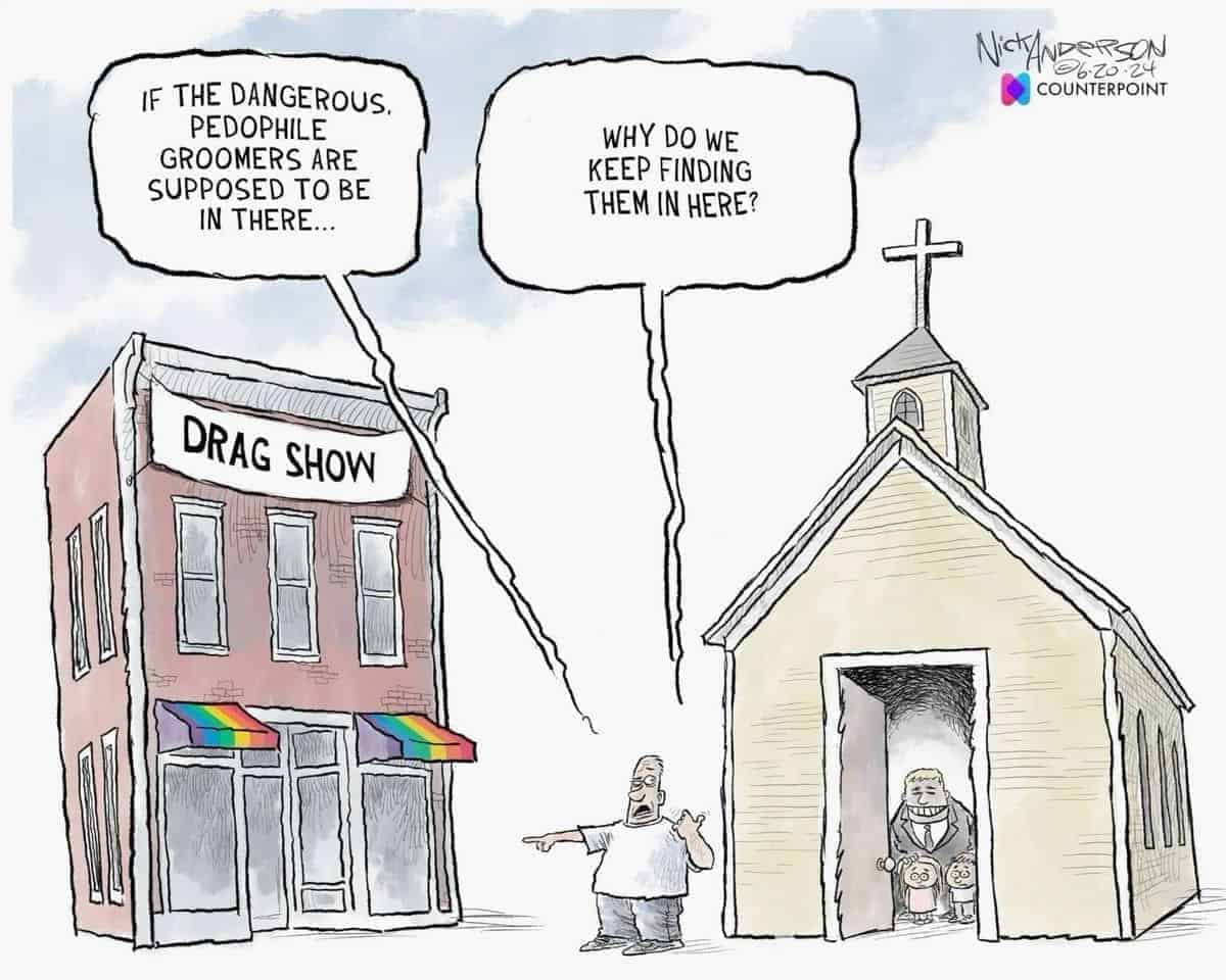 There’s actually a meme that sums it up: the number of children harmed at drag shows is zero. The number harmed in churches? That list is long.